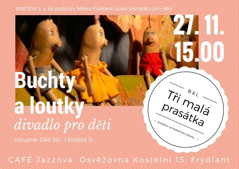 Nejlepší divadlo pod sluncem po roce opět ve frýdlantské Osvěžovně! 😀 Neznáte ještě pražské Buchty a Loutky? Tak se přijďte podívat a poslechnout si, jak si takhle jednou vlk fouknul a jednou houknul a co jen to udělalo za neplechu. A jak prasátka láká na řepu, na sladká jablíčka či na trh. A vše jen proto, aby je slupnul jak malinu… Ale když překonáme strach, tak se můžeme vlkovi dostat na kobylku. Jenže když leze až do domečku, pak nezbývá, než rozdělat pod kotlem oheň, v pravou chvíli zvednout pokličku a …