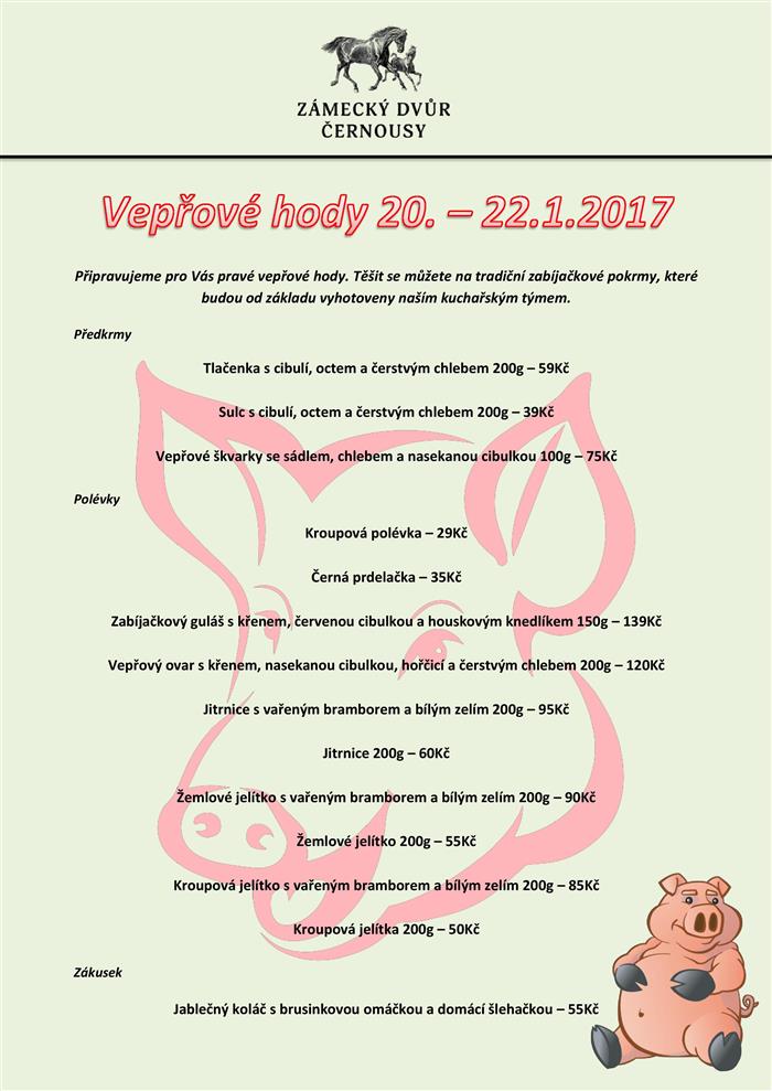Zámecký dvůr Černousy pro Vás připravuje pravé vepřové hody. Těšit se můžete na tradiční zabíjačkové pokrmy, které budou od základu vyhotoveny kuchařským týmem.