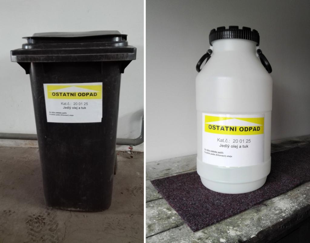 Upozornění: Použité potravinářské oleje a tuky musí být předávány buď v pevných obalech, např. PET lahvích, nebo uzavíratelných tetrapakových obalech (od mléka či jiných nápojů). Nebo lze oleje a tuky vylít do sběrné nádoby a vlastní obal si opět odnést na další použití.