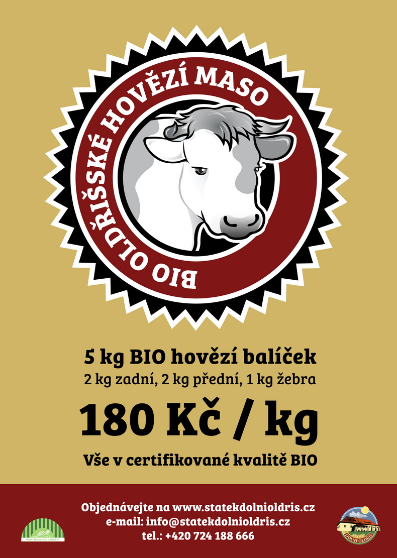 Statek Dolní Oldřiš přichází s nabídkou jehněčího a hovězího masa v certifikované BIO kvalitě. 5 kg BIO hovězí balíček (2 kg zadní, 2 kg přední, 1 kg žebra) za 180 Kč / kg nebo 3 kg BIO jehněčí balíček za 200 Kč / kg.