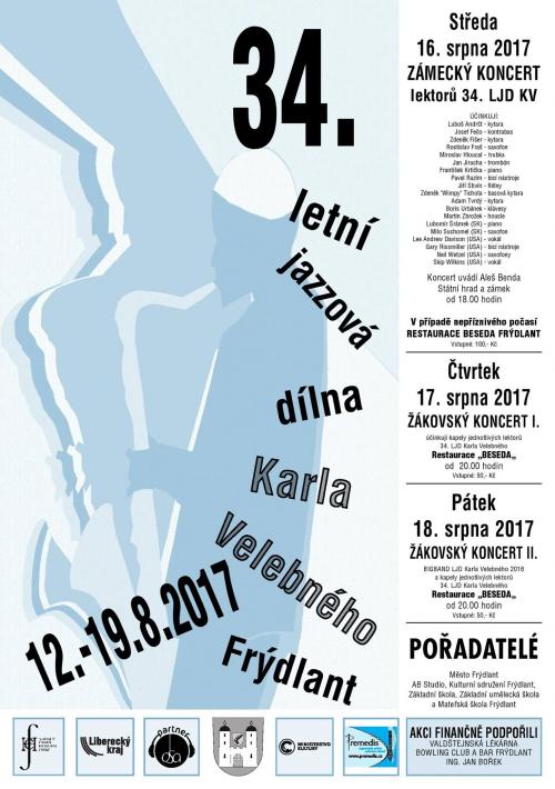 Letošní 34. Letní jazzovou dílnu Karla Velebného laskavě podpořili Město Frýdlant v Čechách, Ministerstvo kultuty ČR, Liberecký kraj, Partnerství OSA, Nadace ČHF, Ing. Jan Bořek a Premedis