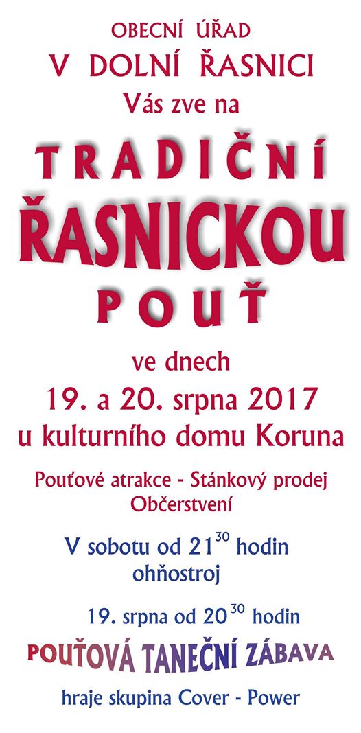 V sobotu od 20.30 Pouťová taneční zábava – hraje skupina Cover – Power a od 21.30 hodin ohňostroj