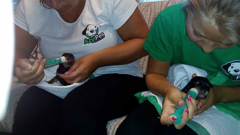 Štěňata byla svázaná a zakrytá trávou. Houbaři nahlásili nález policistům, která mláďata, pravděpodobně křížence rotvajlera, odvezla do útulku v Krásném lese.