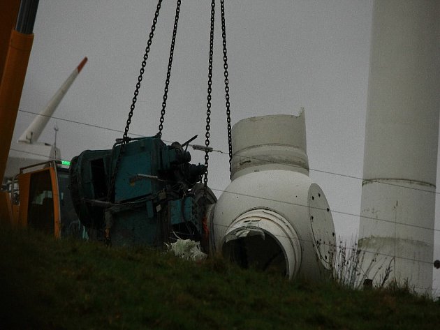 Na Albrechtickém kopci stojí větrných elektráren několik, náš čtenář pohotově stihl vyfotit zkázu, kterou napáchala vichřice na jedné z větrných turbín.