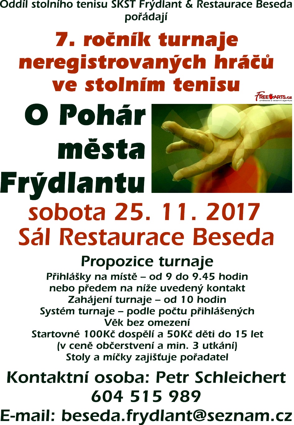 Oddíl stolního tenisu SKST Frýdlant & Restaurace Beseda pořádají 7. ročník turnaje hráčů ve stolním tenisu O Pohár města Frýdlantu