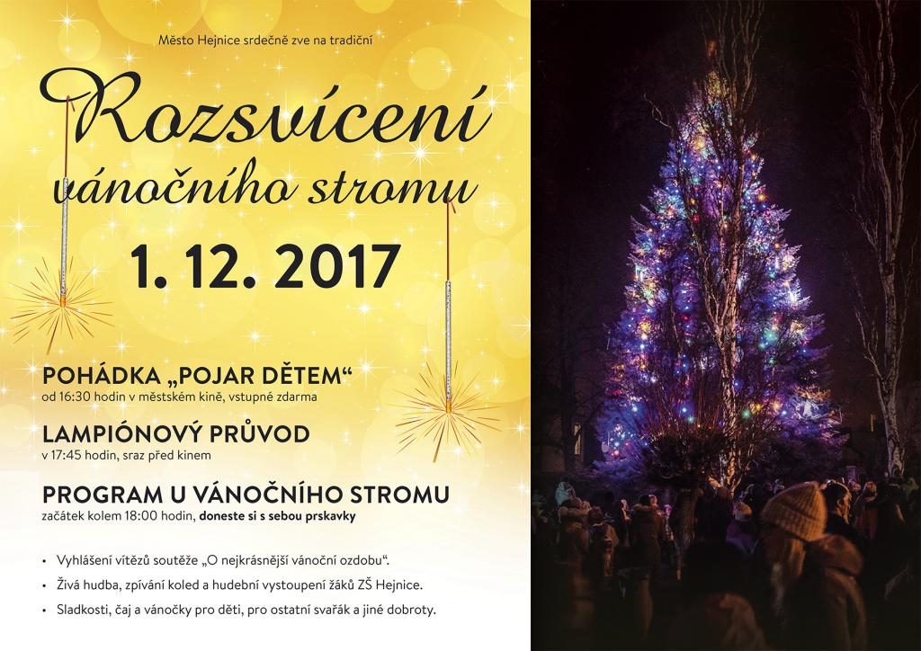 Tradiční rozsvěcení vánočního stromu v hejnickém parčíku bude v pátek 1. prosince kolem 18 hodiny. Program začne v 16.30 hodin v městském kině pohádkou pro děti zdarma. Promítá se Pojar dětem. Následovat bude od 17.30 hodin lampiónový průvod od kina ke stromečku. Tam se vyhlásí soutěž o nejkrásnější vánoční ozdobu. O hudební doprovod se postarají děti z naší základní školy a dojde i na dárečky a vlastní probuzení stromečku. Prskavky s sebou.