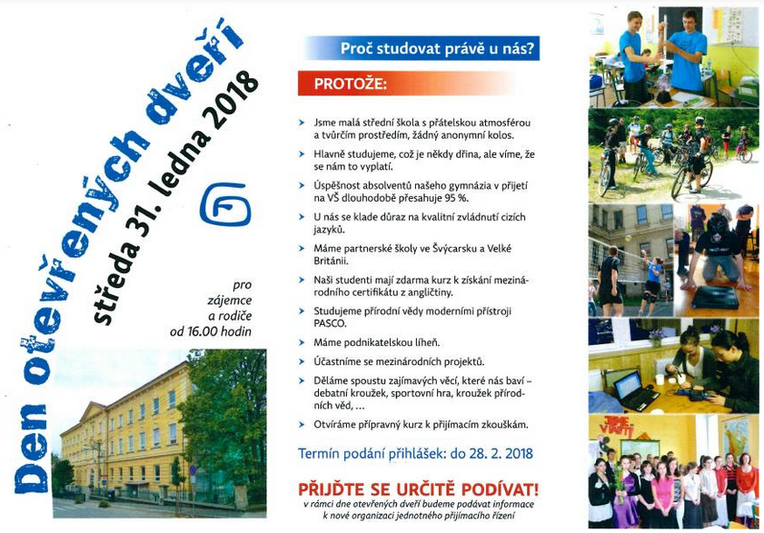 Na Den otevřených dveří zve ve středu 31. ledna 2018 všechny zájemce a uchazeče o studium, jejich rodiče i třídní kolektivy Gymnázium Frýdlant. Informace o studiu, školních zájmových aktivitách, mezinárodních projektech, jazykových certifikátech i uplatnění absolventů budou podávány od 16.00 hodin.