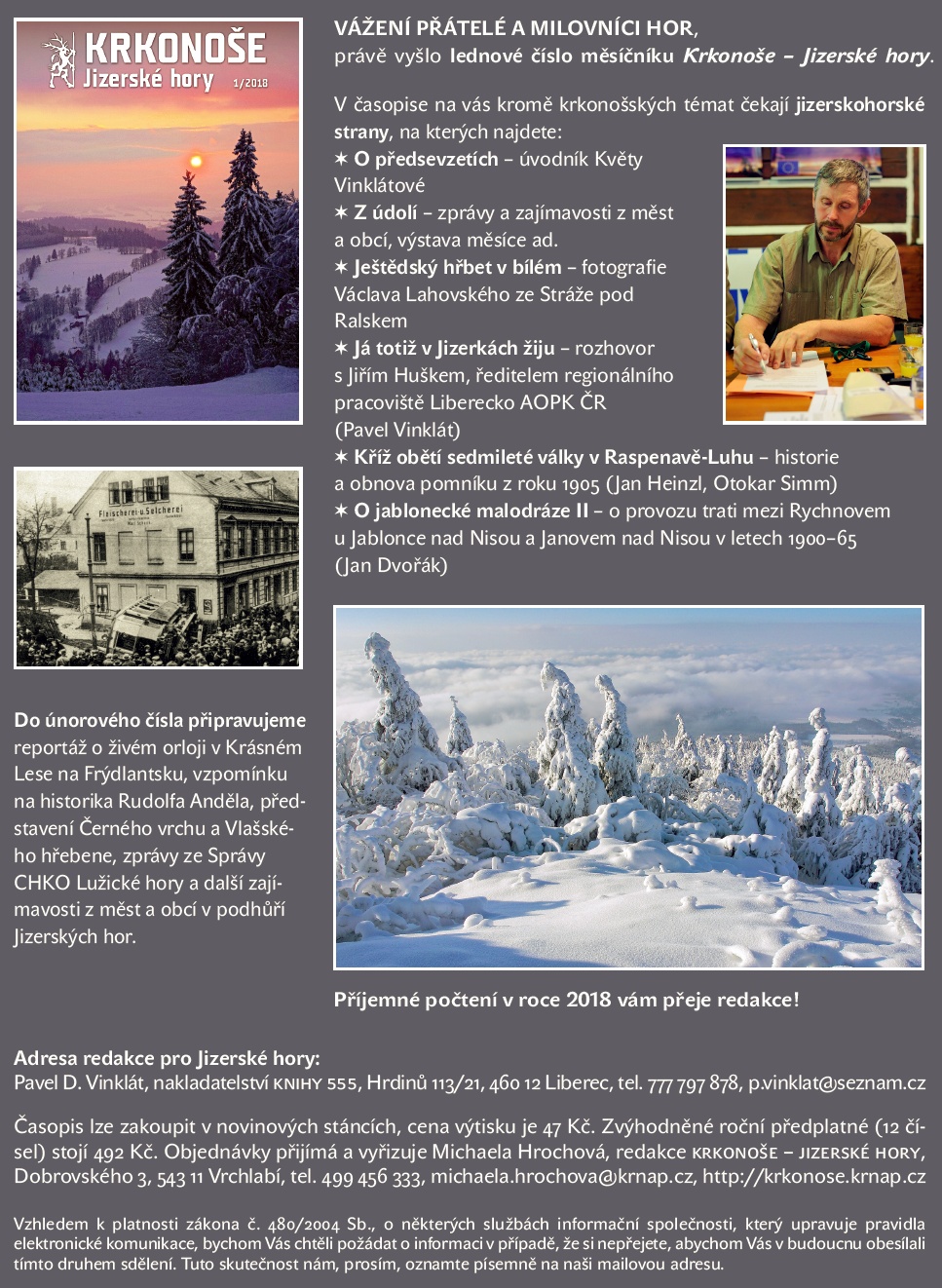 právě vyšlo lednové číslo měsíčníku Krkonoše – Jizerské hory. V časopise na vás kromě krkonošských témat čekají jizerskohorské strany, na kterých najdete: