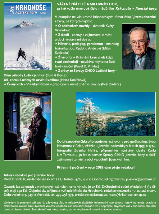 právě vyšlo únorové číslo měsíčníku Krkonoše – Jizerské hory. V časopise na vás kromě krkonošských témat čekají jizerskohorské strany, na kterých najdete: