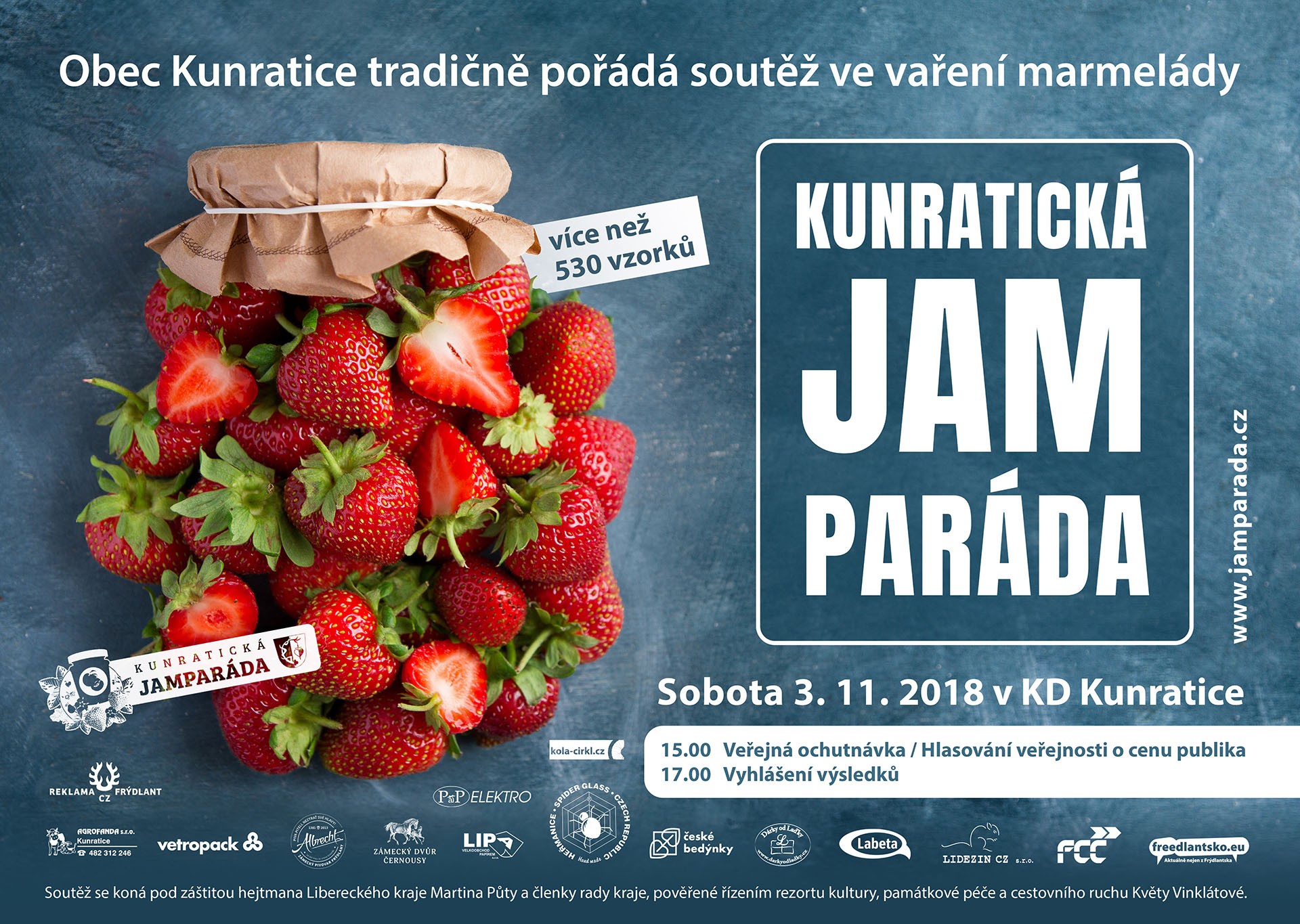 V Kulturním domě obce Kunratice u Frýdlantu byl tuto sobotu 3. listopadu 2018 zakončen letošní ročník soutěže Kunratická Jamparáda veřejnou ochutnávkou džemů a marmelád. Návštěvníci akce, mezi nimiž byl i senátor Ing. Michael Canov, měli možnost ochutnat celkem 536 vzorků rozdělených do 35ti kategorií. Byla zde možnost ochutnat tradiční i netradiční džemy a marmelády z domácího i exotického ovoce, a dokonce i ze zeleniny. Do letošního ročníku se přihlásilo 162 soutěžících z celé České republiky i ze zahraničí, například z Polska, Slovenska a Rakouska, také ze španělského ostrova Lanzarote a z dalekých Filipín.