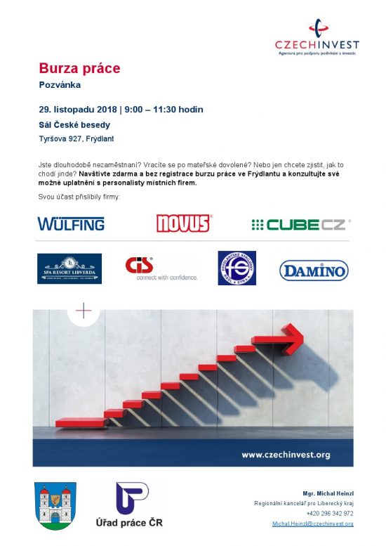 Jste dlouhodobě nezaměstnaní? Vracíte se po mateřské dovolené? Nebo jen chcete zjistit, jak to chodí jinde? Navštivte zdarma a bez registrace burzu práce ve Frýdlantu a konzultujte své možné uplatnění s personalisty místních firem. Burza práce proběhne v sále restaurace Beseda ve čtvrtek 29. listopadu 2018 od 9.00 do 11.30 hodin. Burzu práce organizuje Agentura pro podporu podnikání a investic CzechInvest.