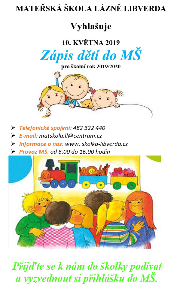 Zápis dětí do MŠ pro školní rok 2019/2020 proběhne 10. května 2019.