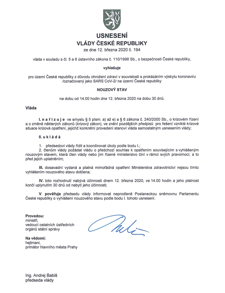 Vláda v souladu s čl. 5 a 6 ústavního zákona č. 110/1998 Sb., o bezpečnosti České republiky, vyhlašuje pro území České republiky z důvodu ohrožení zdraví v souvislosti s prokázáním výskytu koronaviru (označovaný jako SARS CoV-2) na území České republiky nouzový stav na dobu od 14.00 hodin dne 12. března 2020 na dobu 30. dnů.