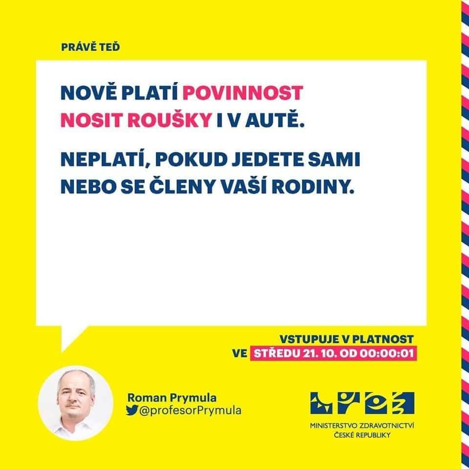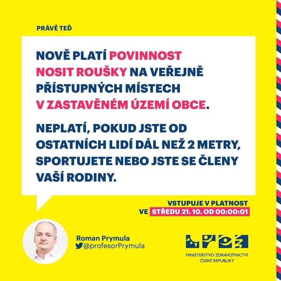 Nosit roušku bude od středy povinné i venku na území obcí, pokud bude člověk blíže než dva metry k jinému. Výjimku budou mít členové jedné rodiny nebo lidé při sportování. Novou povinnost dnes schválila vláda, informoval ministr zdravotnictví Roman Prymula (za ANO). O případném zavedení lockdownu se podle ministra Prymuly nebude diskutovat na vládě tento týden. Podle něj musí opatření prokázat účinnost za 14 dní.