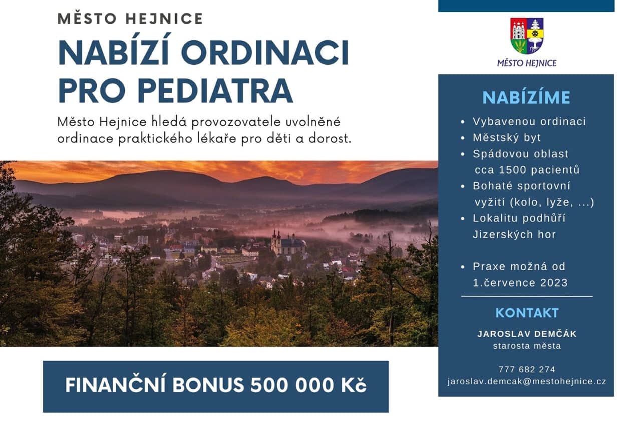 Město Hejnice aktualizuje nabídku uvolněné ordinace dětského lékaře v Hejnicích o finanční bonus 0,5 miliónu korun pro zájemce provozování lékařské pediatrické praxe v Hejnicích.