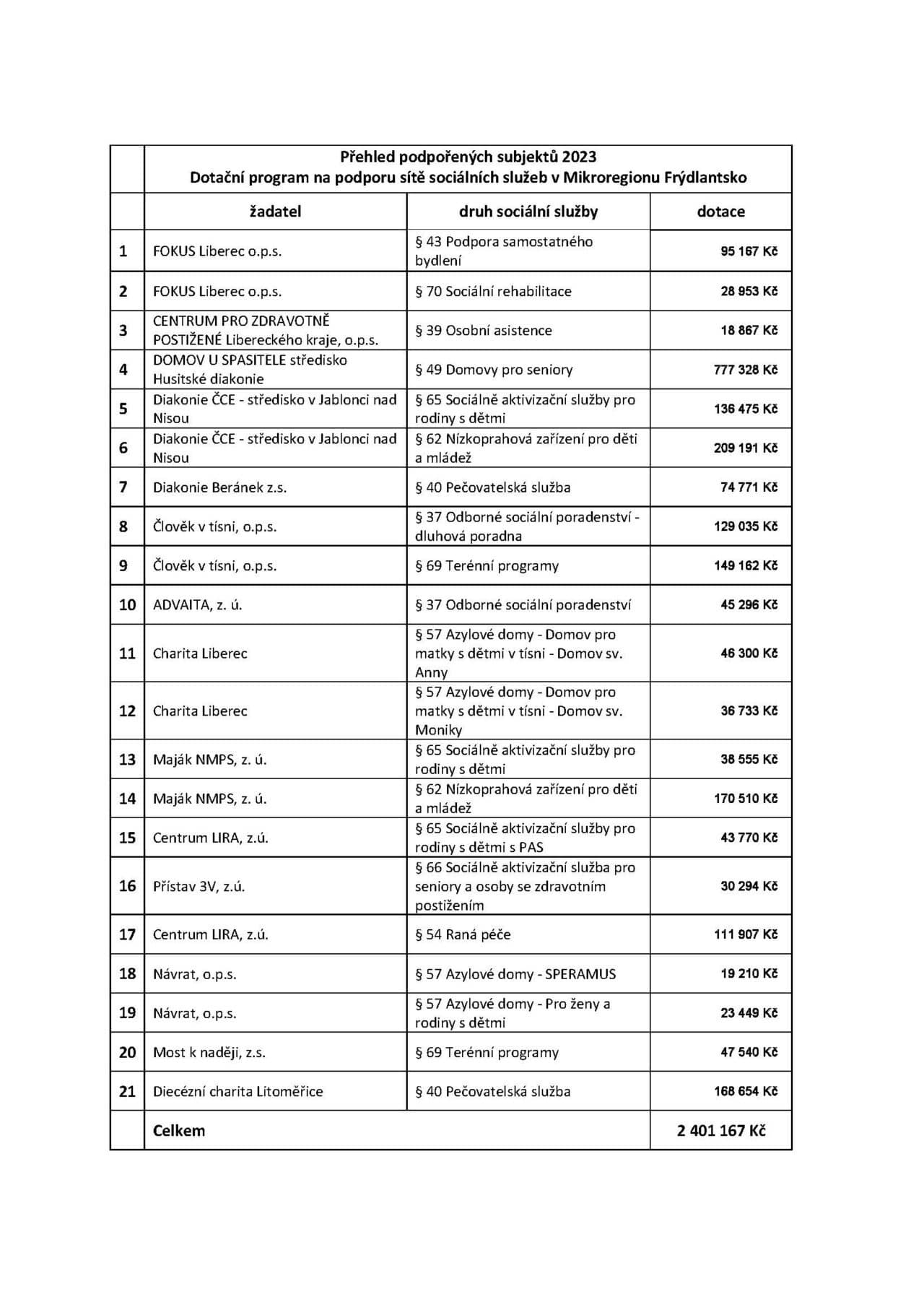 Letos počtvrté rozdělovaly obce Mikroregionu Frýdlantsko společné finanční příspěvky pro poskytovatele sociálních služeb na Frýdlantsku. Celkovou částkou 2 401 167 Kč, kterou členské obce vyčlenily ze svých rozpočtů, bylo podpořeno celkem 14 subjektů s 21 službami.