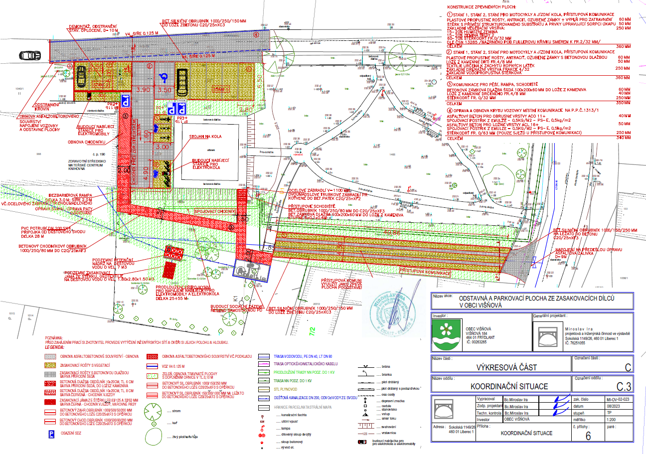 Začátkem července začnou probíhat zemní práce na odstavné a parkovací ploše ze zasakovacích dílců v okolí stávajícího altánu na návsi ve Višňové. Stavebními úpravami vznikne 10 parkovacích míst pro automobily s umístěním nabíjecí stanice pro elektromobily a další parkovací stání pro motorky a kola. Dále na návsi dojde ke zpevnění veškerých přístupových komunikací a chodníků – to vše ze zasakovacích, či zatravňovacích dílců. Uprostřed návsi bude umístěn osvětlený dřevěný rozcestník odkazující na všechny okolní osady obce Višňová a dále také elektronická úřední deska, která bude mimo jiné sloužit jako informační tabule. Celé prostranství bude doplněné stromky a zelení. Projekt dostal finanční podporu ve výši 1.703.243,-Kč z fondu malých projektů Turów. Zemní práce vyjdou obecní rozpočet na 881.218 Kč