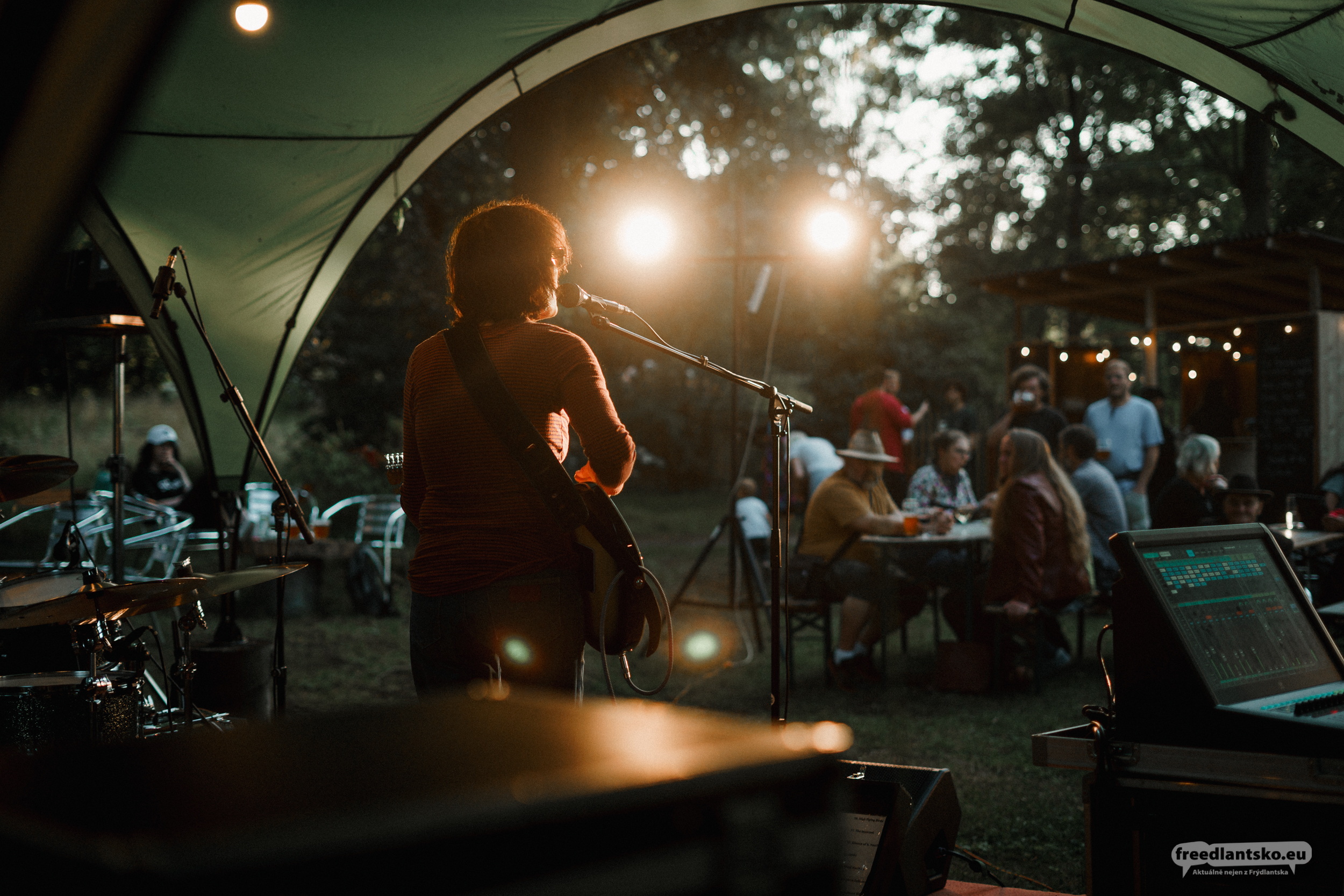 Skvělý koncert kytaristky a zpěvačky Rebekky Zarkavy a bubeníka Jury Doležala se nesl v duchu přátelské atmosféry, které napomohlo nejen intimní prostředí zahrady, ale i nově vybudované zázemí. Dřevěný stánek, který letos v zahradě vyrostl, sloužil jako prostor pro občerstvení a výčep – a rozhodně přispěl k celkovému komfortu návštěvníků i organizátorů.