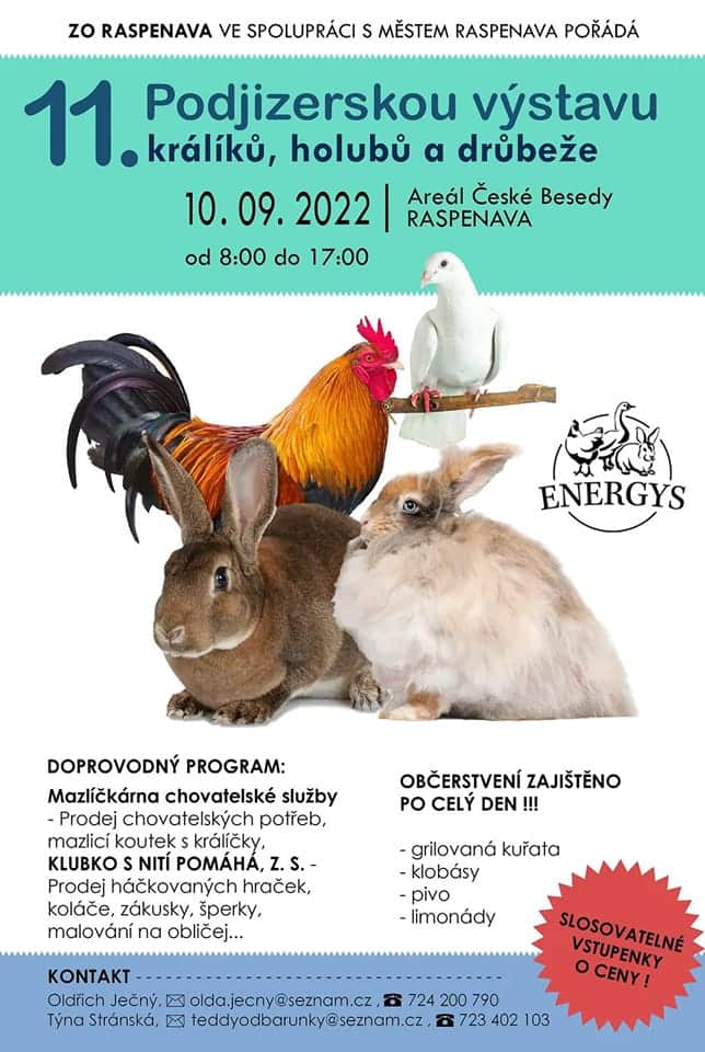 ZO Raspenava ve spolupráci s Městem Raspenava pořádá 11. Podjizerskou výstavu králíků, holubů a drůbeže. Kdy: 10. září 2022 od 8.00 do 17.00 hodin. Kde: Areál České Besedy Raspenava Doprovodný program: Mazlíčkárna chovatelské služby: