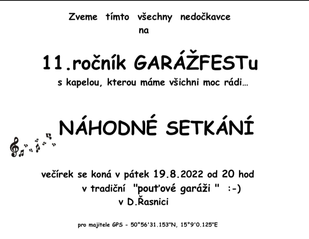 Zveme tímto všechny nedočkavce na 11. ročník GARÁŽFESTu s kapelou, kterou máme všichni moc rádi .. NÁHODNÉ SETKÁNÍ.