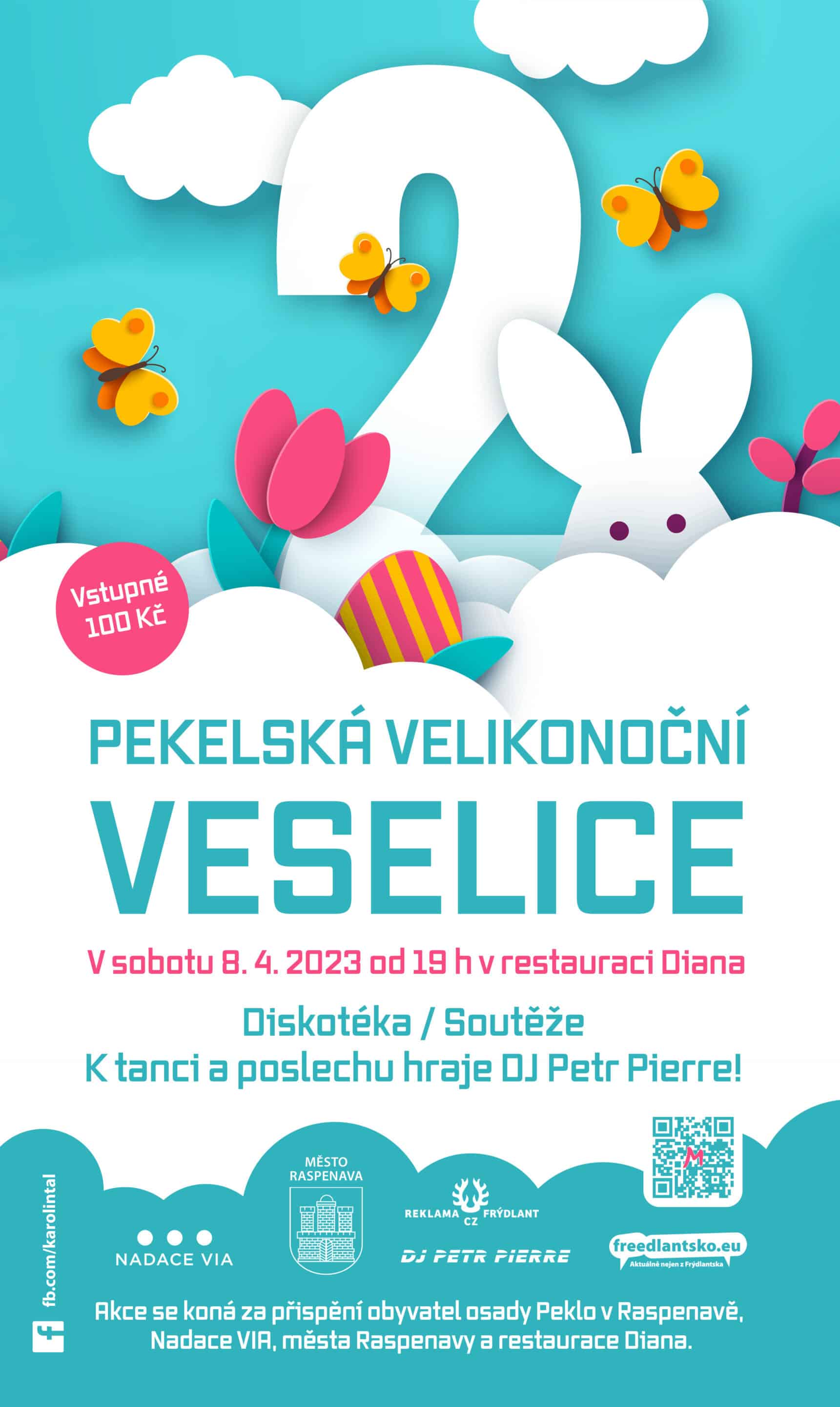 2. Pekelská velikonoční veselice v sále v restauraci Diana (osada Peklo v Raspenavě) Sobota 8. dubna 2023 od 19.00 hodin. vstup 100 Kč diskotéka soutěže k tanci a poslechu hraje DJ Petr Pierre Akce se koná