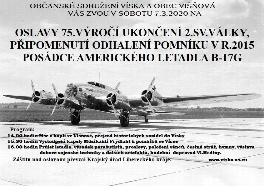 Občanské sdružení Víska a Obec Višňová Vás zvou v sobotu 7. 3. 2020 na oslavy 75. výročí ukončení 2.sv. války, připomenutí odhalení pomníku v roce 2015 posádce amerického letadla B – 17 G.