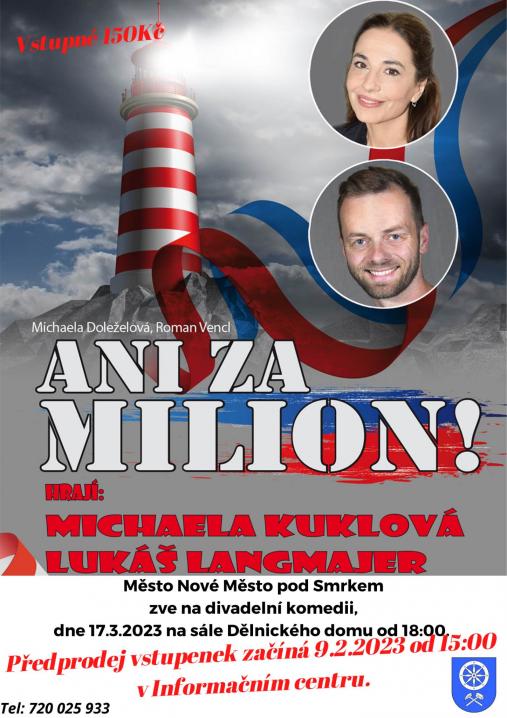 Město Nové Město pod Smrkem vás zve pátek 17. března od 18.00 hodin na divadelní představení Ani za milion! Vstupenky zakoupíte v infocentru v Novém Městě pod Smrkem. Cena