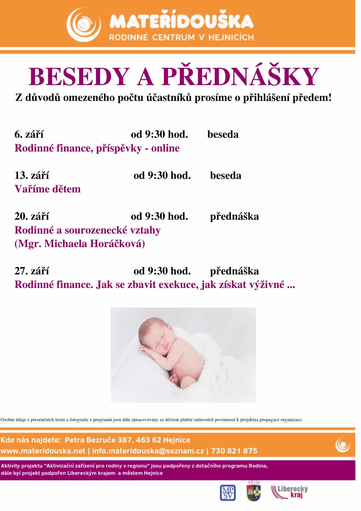 Besedy a přednášky v rodinném centru Mateřídouška v Hejnicích v měsíci září 2022. 6. září od 9.30 hodin beseda Rodinné finance, příspěvky – online 13. září od 9.30 hodin beseda Vaříme dětem 20.