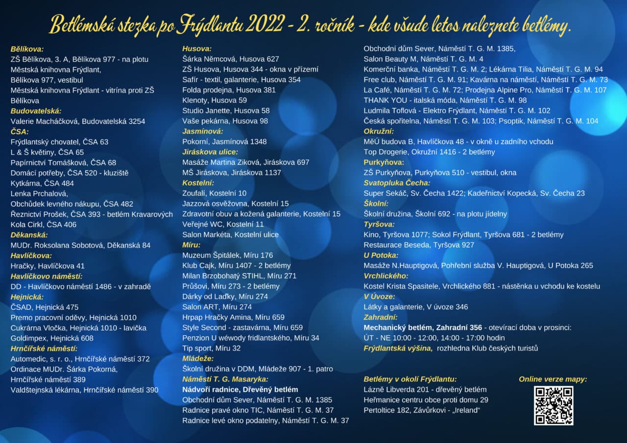 Seznam těch, kteří se zapojili do výzvy Města Frýdlant a do okna, výlohy či na plot si betlém první adventní neděli vystavili, najdete na plánku, který je k dostání v Turistickém informačním centru v přízemí radnice. Zajděte si tam pro něj nebo si ho stáhněte zde a vydejte se kdykoli během adventu na cestu po frýdlantské Betlémské stezce. Na mapu se také můžete podívat zde.
