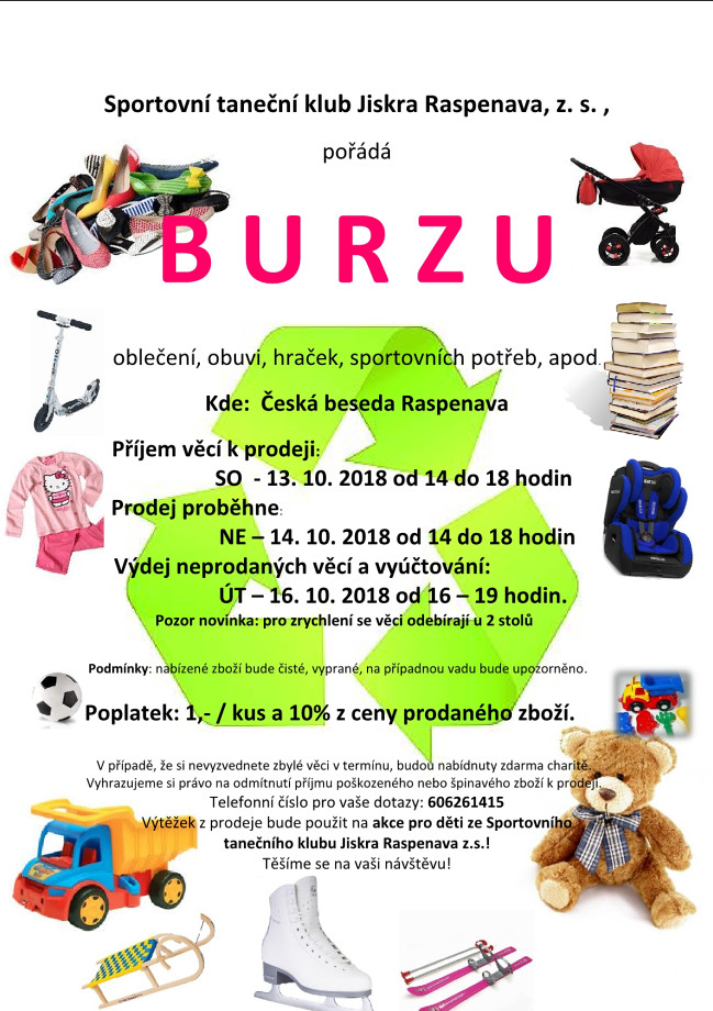 Sportovní taneční klub Jiskra Raspenava, z. s. , pořádá B U R Z U oblečení, obuvi, hraček, sportovních potřeb, apod. Kde: Česká beseda Raspenava Příjem věcí k prodeji : SO – 13. 10. 2018 od