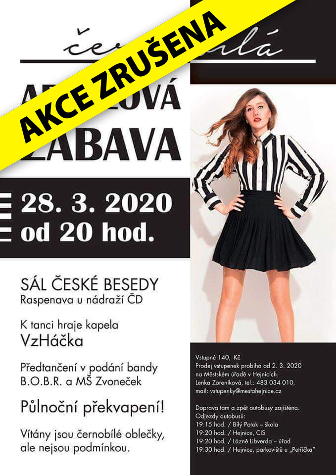 28. 3. 2020 do 20 h sál České Besedy v Raspenavě. Hrají VzHáčka. Půlnoční překvapení. Předtančení B.O.B.R. a MŠ Zvoneček. Vstupné 140 Kč.