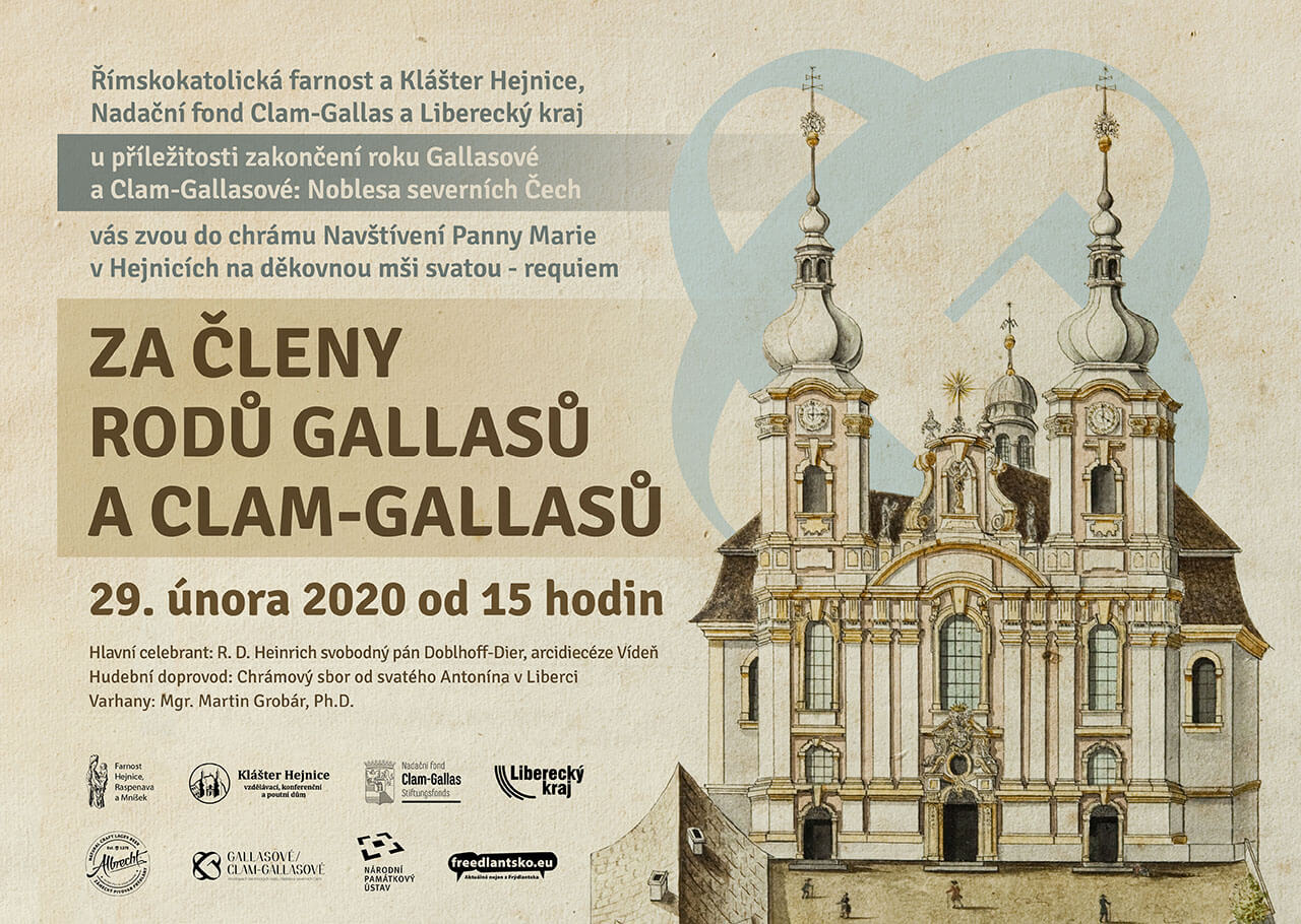 Římskokatolická farnost a Klášter Hejnice, Nadační fond Clam-Gallas a Liberecký kraj u příležitosti zakončení roku Gallasové a Clam-Gallasové: Noblesa severních Čech vás zvou do chrámu Navštívení Panny Marie v Hejnicích na děkovnou mši svatou – requiem za členy rodů Gallasů a Clam-Gallasů 29. února 2020 od 15 hodin.