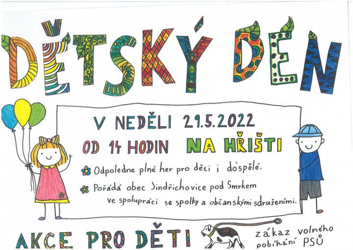 Zveme vás na oslavu Mezinárodního dne dětí, která se uskuteční v neděli 29. května 2022 od 14.00 hodin na fotbalovém hřišti v Jindřichovicích pod Smrkem.