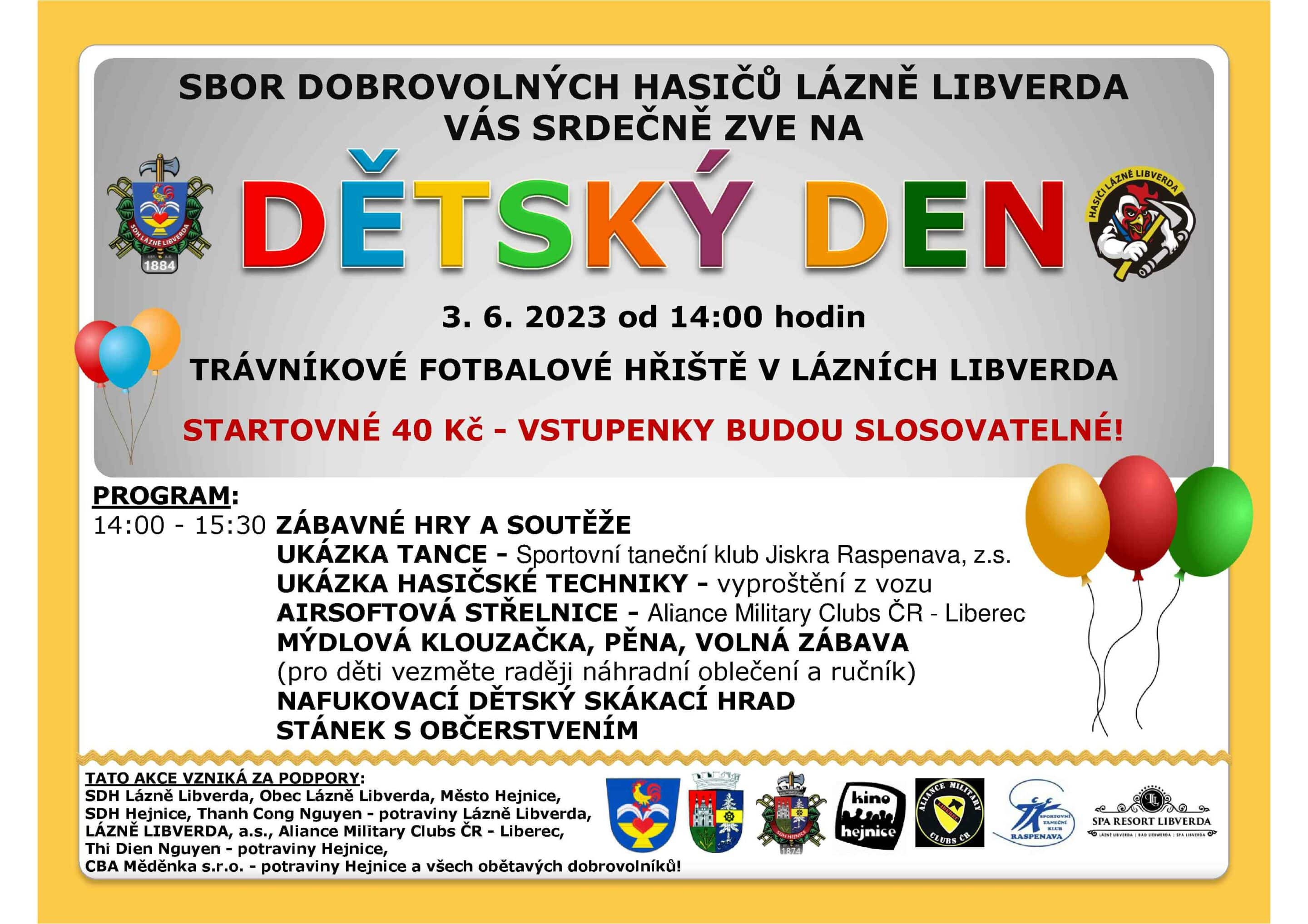 Sbor dobrovolných hasičů Lázně Libverda vás srdečně zve v sobotu 2.6.2023 od 14.00 hodin na Dětský den.
