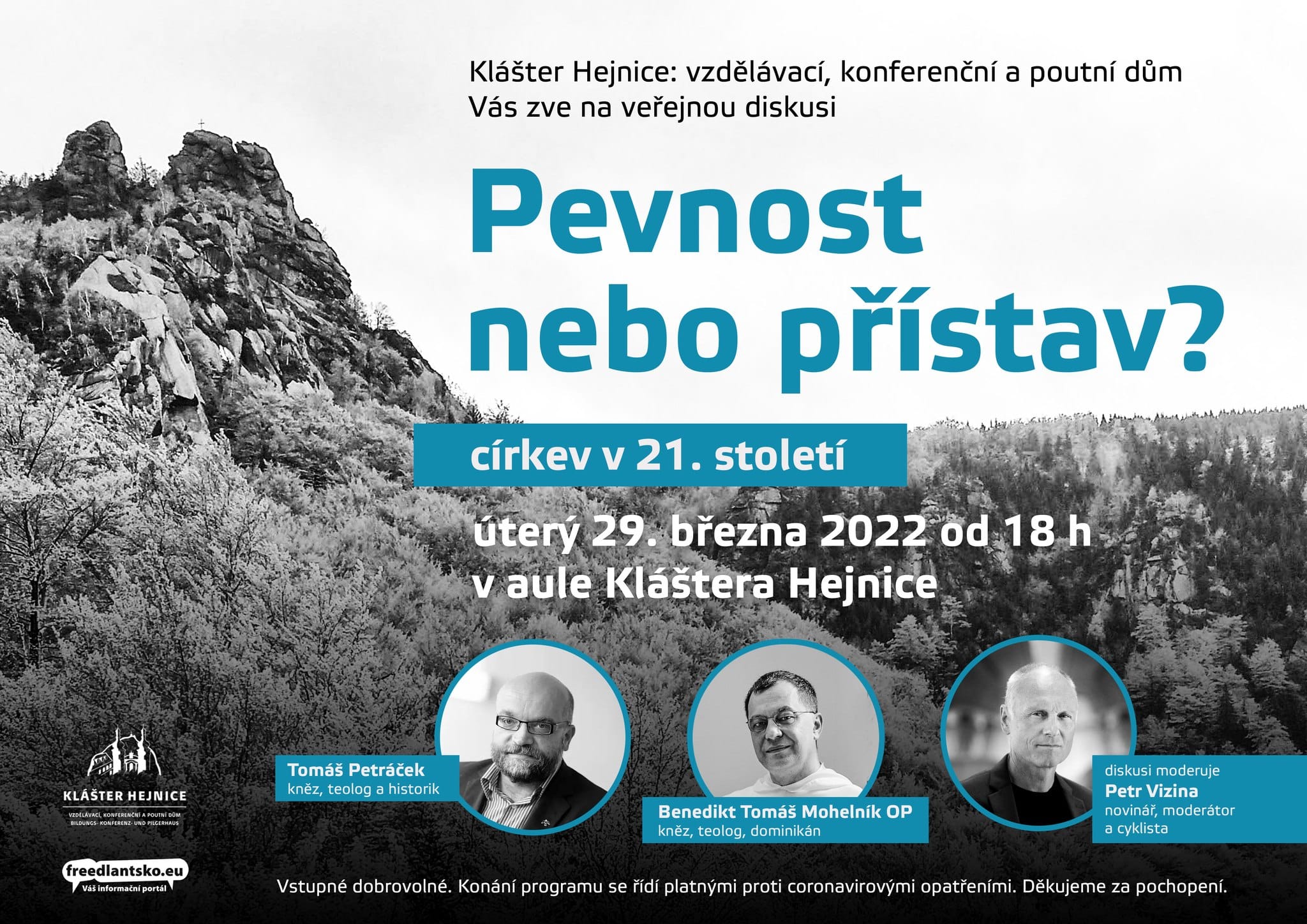 Zrušená diskuse na téma církev ve 21. století má nový termín. V úterý 29. března od 18.00 hodin v aule Klášter Hejnice: vzdělávací, konferenční a poutní dům budou diskutovat Tomáš Petráček