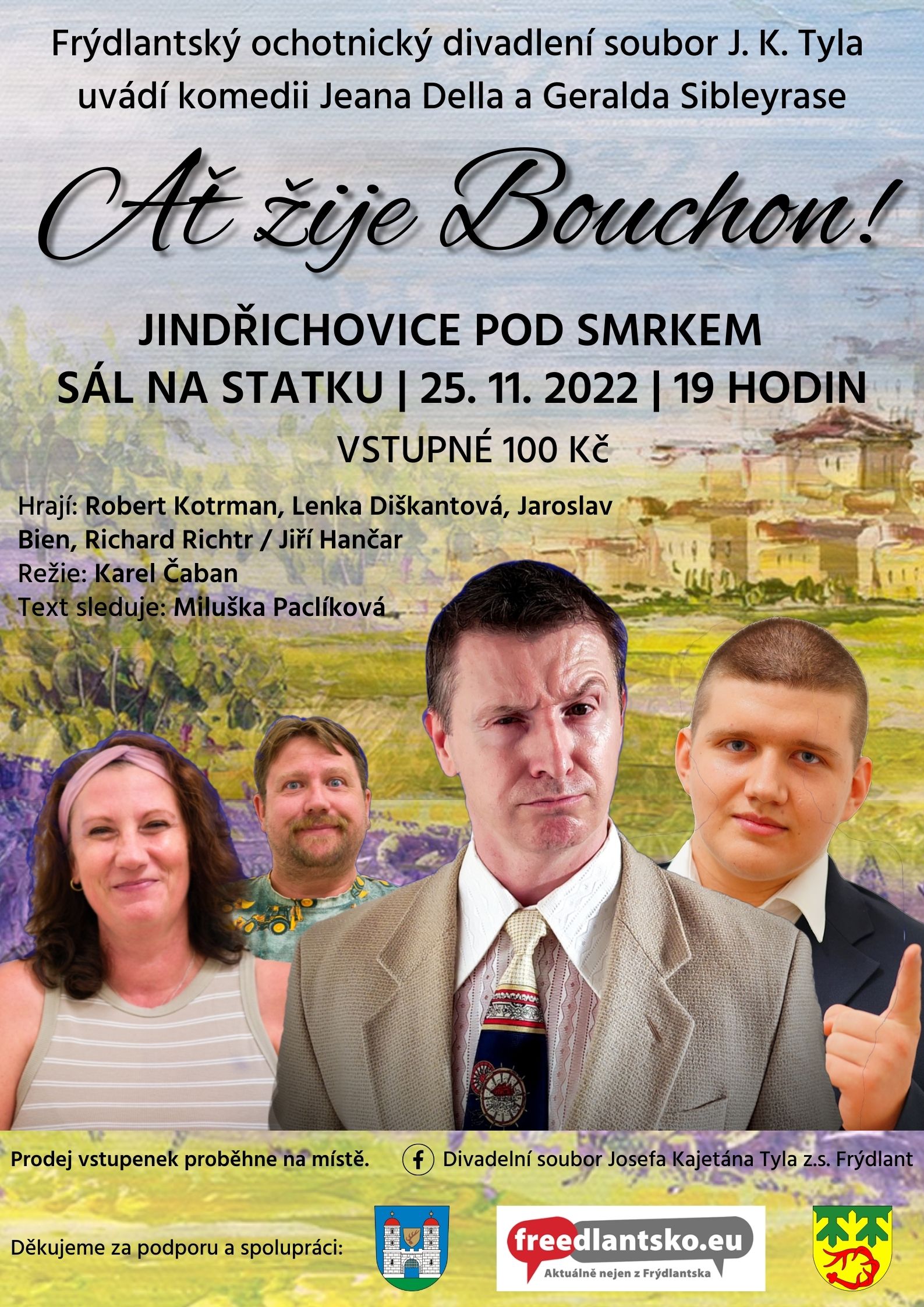 Divadelní představení Ať žije Bouchon! 25. listopadu 2022 od 19.00 hodin na sále Statku v Jindřichovicích pod Smrkem Vstupné 100 Kč. Vstupenky budou v prodeji pouze na místě. Francouzská komedie Jeana Della a