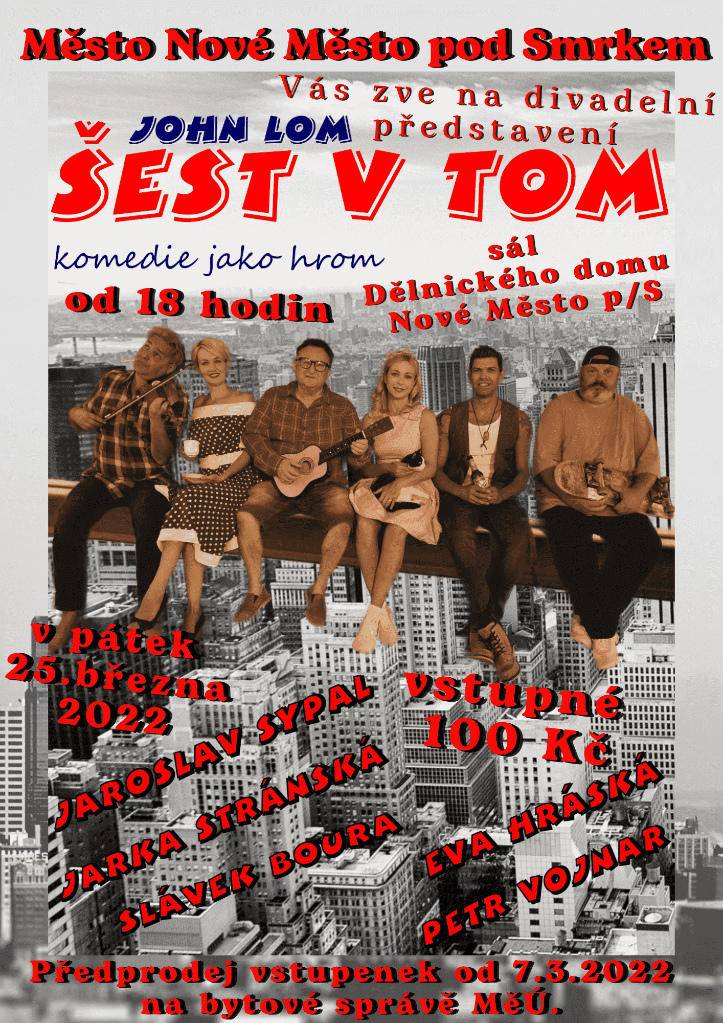 Nové město pod Smrkem vás zve dne 25. března 2022 od 18.00 hodin do sálu Dělnického domu na divadelní komedii .„Šest v tom“.