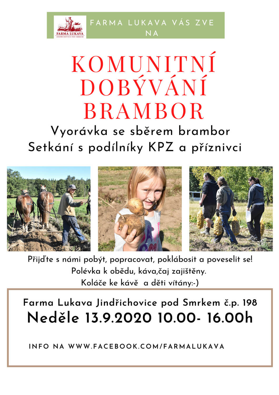 Farma Lukava Vás zve na KOMUNITNÍ DOBÝVÁNÍ BRAMBOR VYORÁVKA SE SBĚREM BRAMBOR A SETKÁNÍ S PODÍLNÍKY KPZ A PŘÍZNIVCI Kde: Farma Lukava Jindřichovice pod Smrkem č.p. 198 Kdy: Neděle 13.9. 2020 10.00