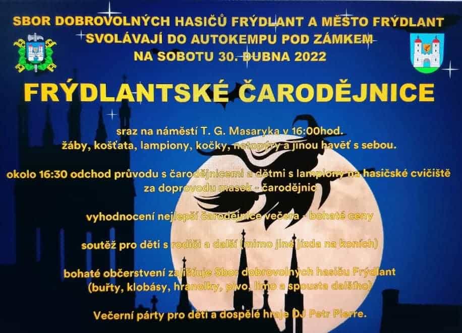 Sbor dobrovolných hasičů Frýdlant a město Frýdlant svolávají do autokempu pod zámkem na 30. dubna 2022 Frýdlantské čarodějnice. Čarodějnice budou zahájeny v 16.00 hodin srazem na náměstí T. G. Masaryka –