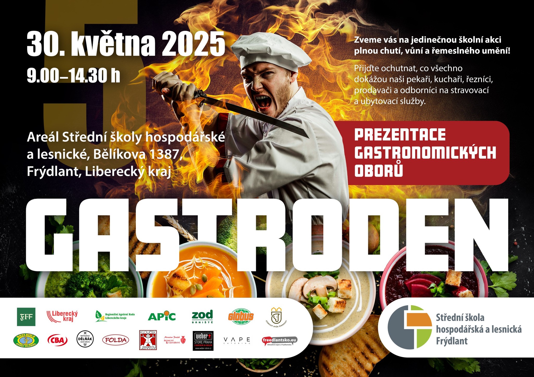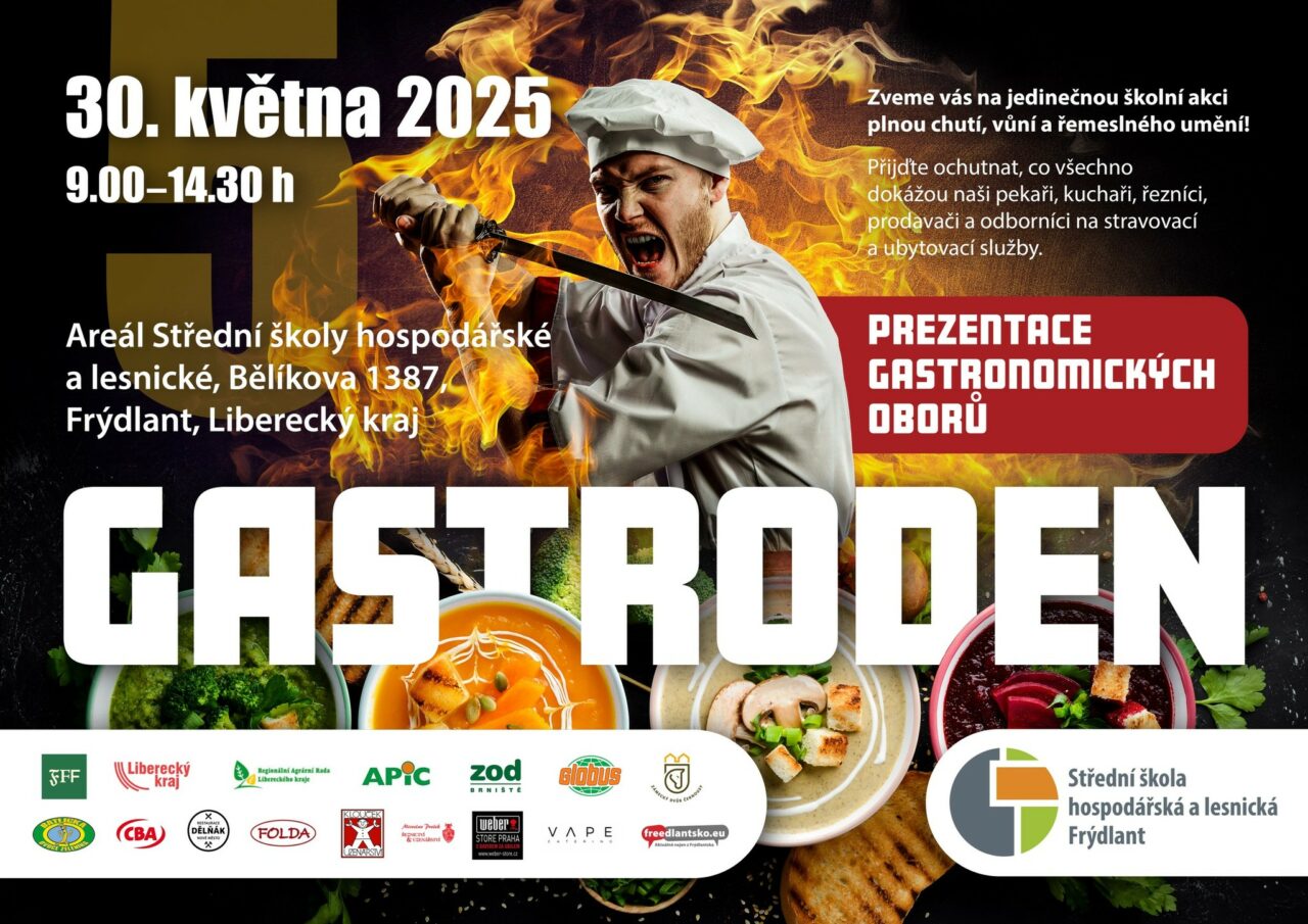 Střední škola hospodářská a lesnická zve na GASTRODEN 2025! Kdy: 30. května 2025 Čas: 9:00–14:30 Kde: areál Bělíkova, Frýdlant