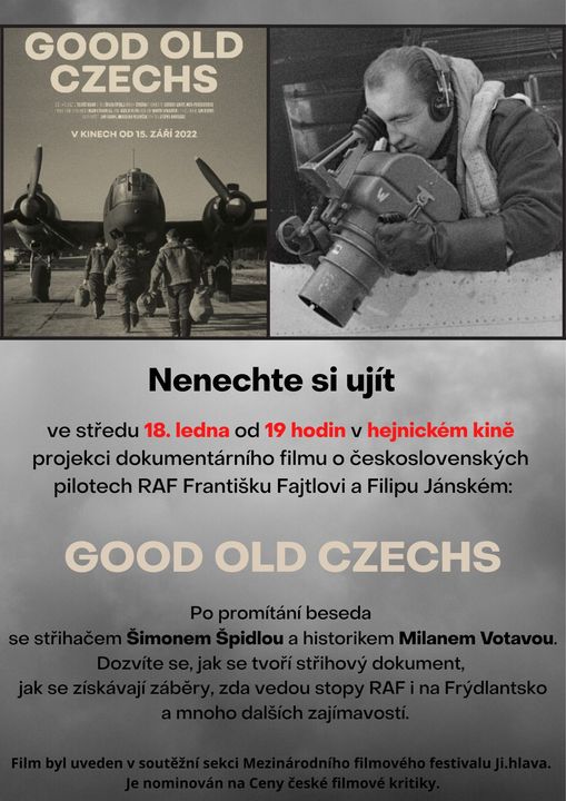 Hejnické kino zve ve středu 18. ledna 2023 od 19 hodin do městského kina v Hejnicích na projekci filmu GOOD OLD CZECHS. O filmu: Odysea českých letců válečnou Evropou. Příběh
