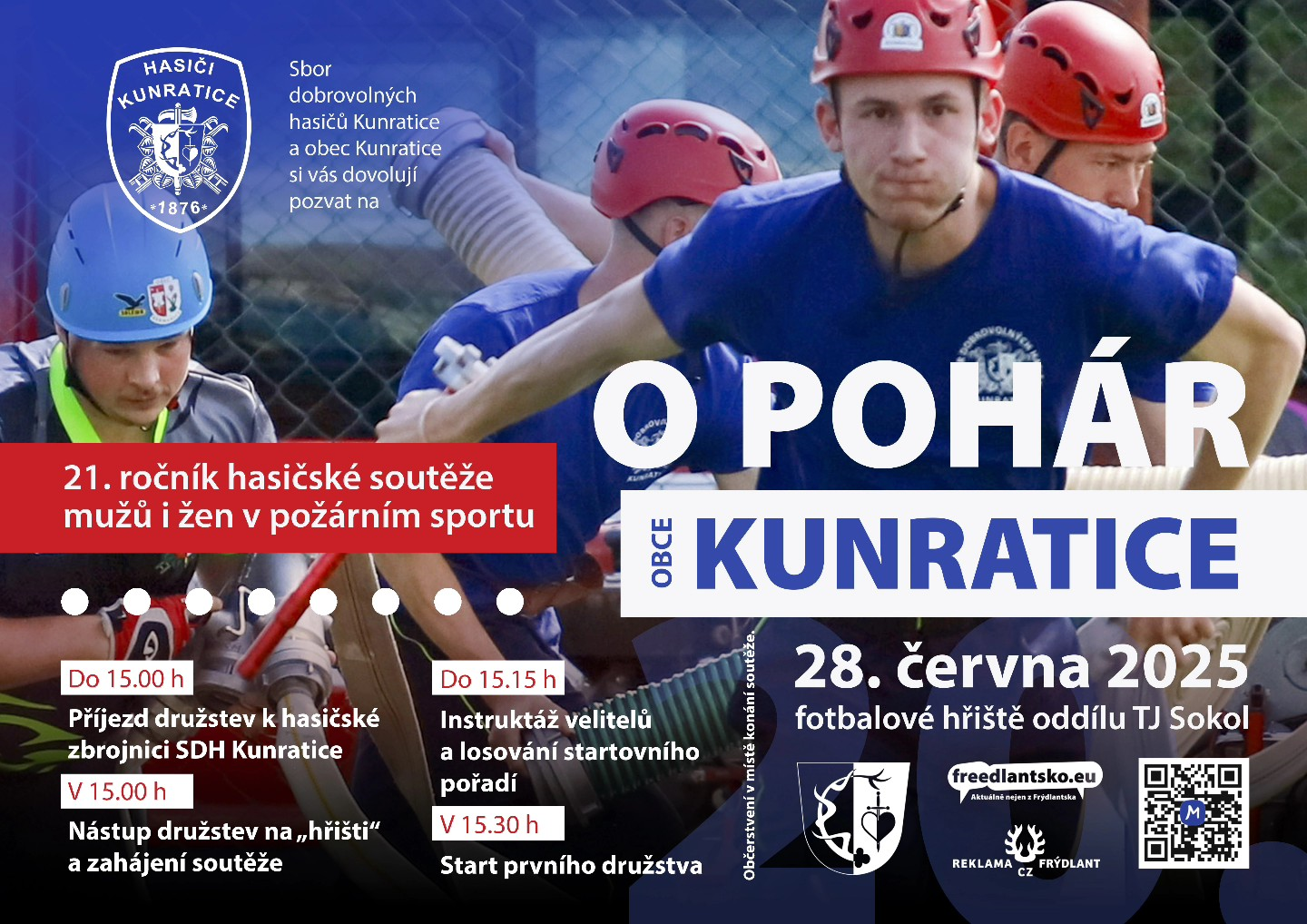 2025so28červen15.30Hasičská soutež v KunraticíchFotbalové hřiště Kunratice15.30(GMT+02:00) Druh akceHasiči,Soutěže,Sport,Závody