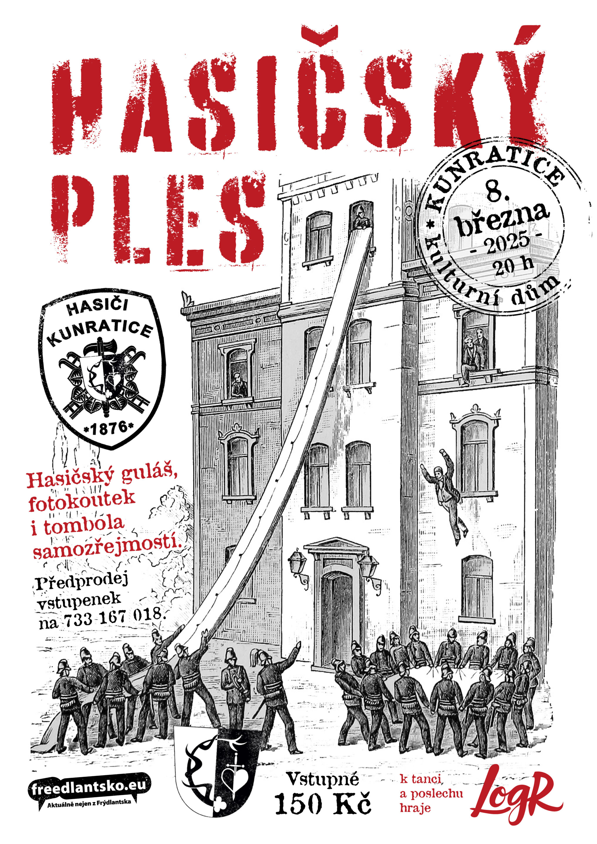 Hasičský ples v Kunraticích 2025 8. března 2025 od 20 hodin v Kulturním domě v Kunraticích. Hasičský guláš, fotokoutek i tombola samozřejmostí. K tamci a poslechu hraje LogR. Předprodej vstupenek na telefonu 733