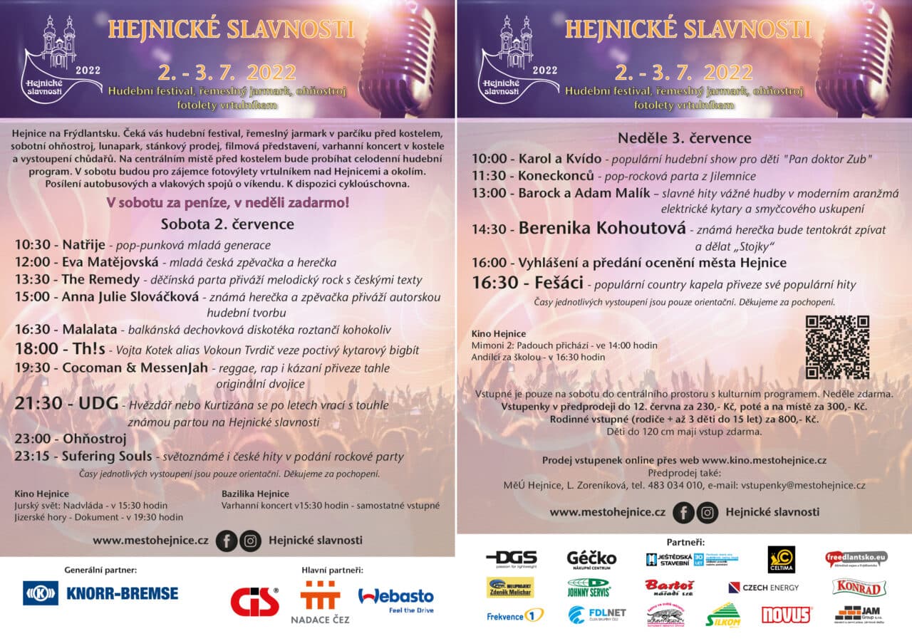 Během dvou letních dnů, kdy se každoročně vracela do Hejnic tradiční pouť, nabízíme občanům a návštěvníkům města široké pole zábavného programu a kulturních zážitků.