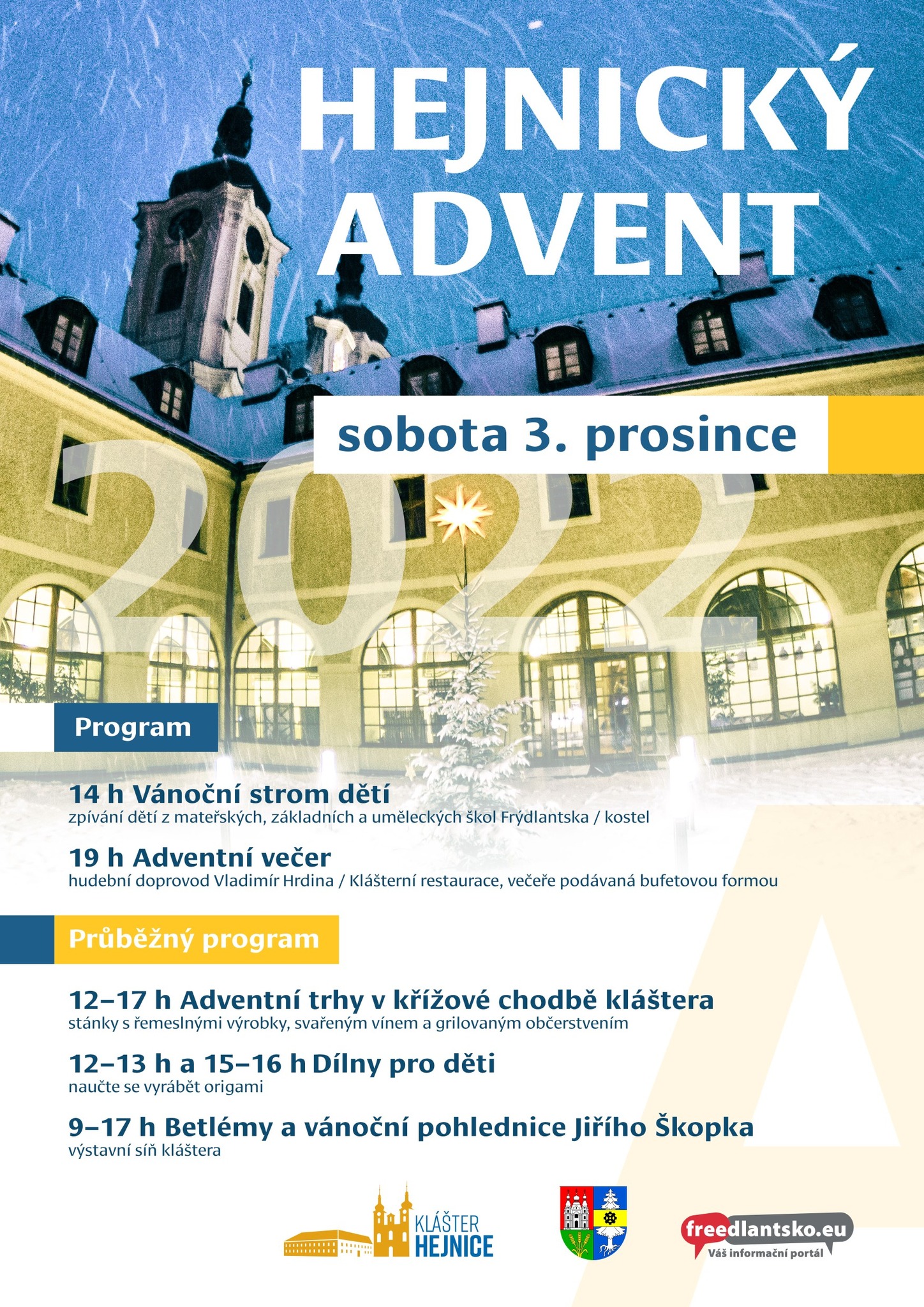 V sobotu 3. prosince 2022 se uskuteční v krásných prostorech hejnického kláštera Hejnický advent 2022. 14.00 Vánoční strom dětí – zpívání dětí z mateřských, základních a uměleckých škol Frýdlantska /