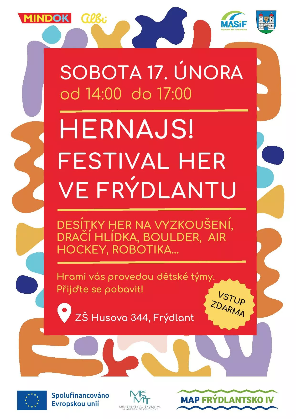Festival Her pořádá MAP Frýdlantsko spolu s místními školami (ZŠ Frýdlant, ZŠ Dětřichov, ZŠ Višňová) a DDM ve Frýdlantu i v Novém Městě. Návštěvníci festivalu si mohou vyzkoušet desítky různých her pod vedením lektorů z řad dětí, sestavit robota, zahrát si air hockey, vyzkoušet si boulderování. Speciálními hosty bude také výrobce her Mindok a spolek Dračí hlídka. Vstup je zdarma a aktivní hráči získají drobnou odměnu.