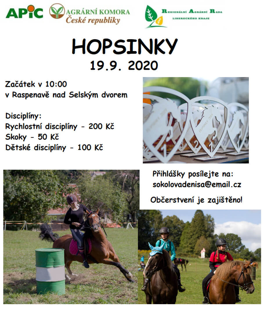 HOPSINKY 19. 9. 2020 Začátek v 10:00 hodin v Raspenavě nad Selským dvorem Disciplíny: Rychlostní disciplíny – 200 Kč Skoky – 50 Kč Dětské disciplíny – 100 Kč Přihlášky posílejte na: sokolovadenisa@email.cz Občerstvení zajištěno!