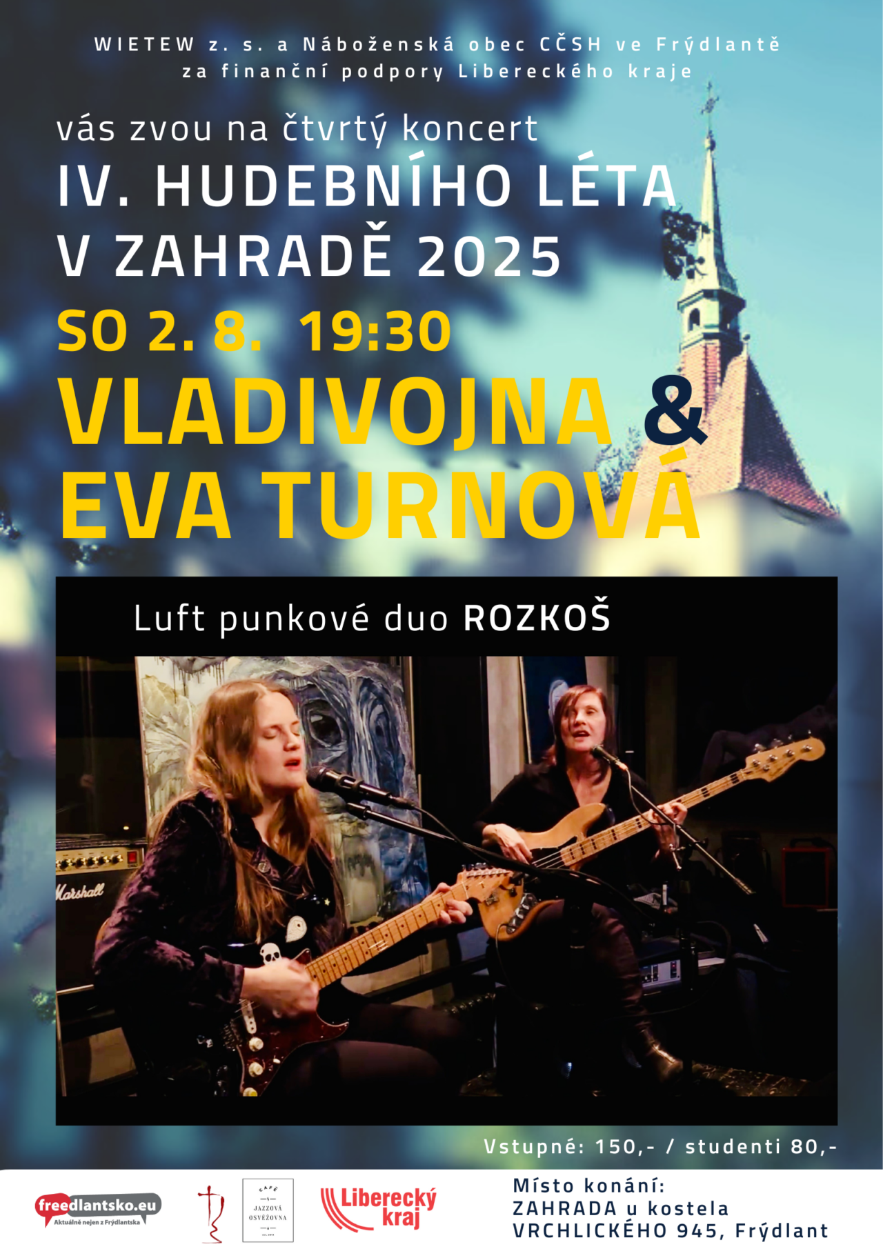2025so02srpen19.3022.00Hudební léto na zahradě: VLADIVOJNA LA CHIA + EVA TURNOVÁFrýdlant / Farská zahrada u Kostela Krista Spasitele, Vrchlického 945, 464 01 Frýdlant, Česko19.30 - 22.00(GMT+02:00) Druh akceCAFÉ Jazzová osvěžovna,Festival,Hudba,Koncert,Rodinná akce,Veřejná akce