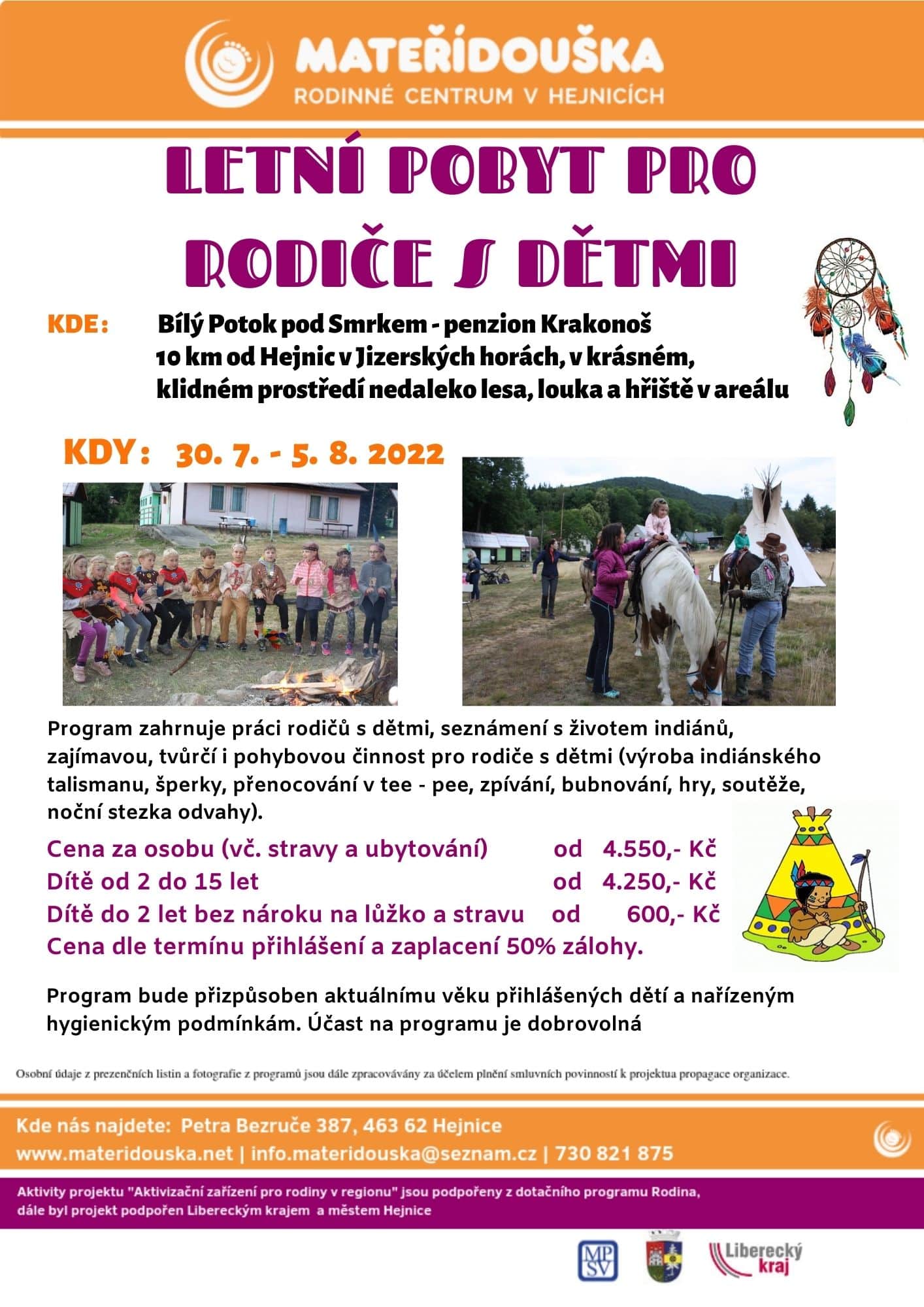 Indiánský letní pobyt pro rodiče s dětmi. Rekreační areál Krakonoš Bílý Potok pod Smrkem 150 463 62 Hejnice 10 km od Hejnic v Jizerských horách, v krásném, klidném prostředí nedaleko lesa, louka