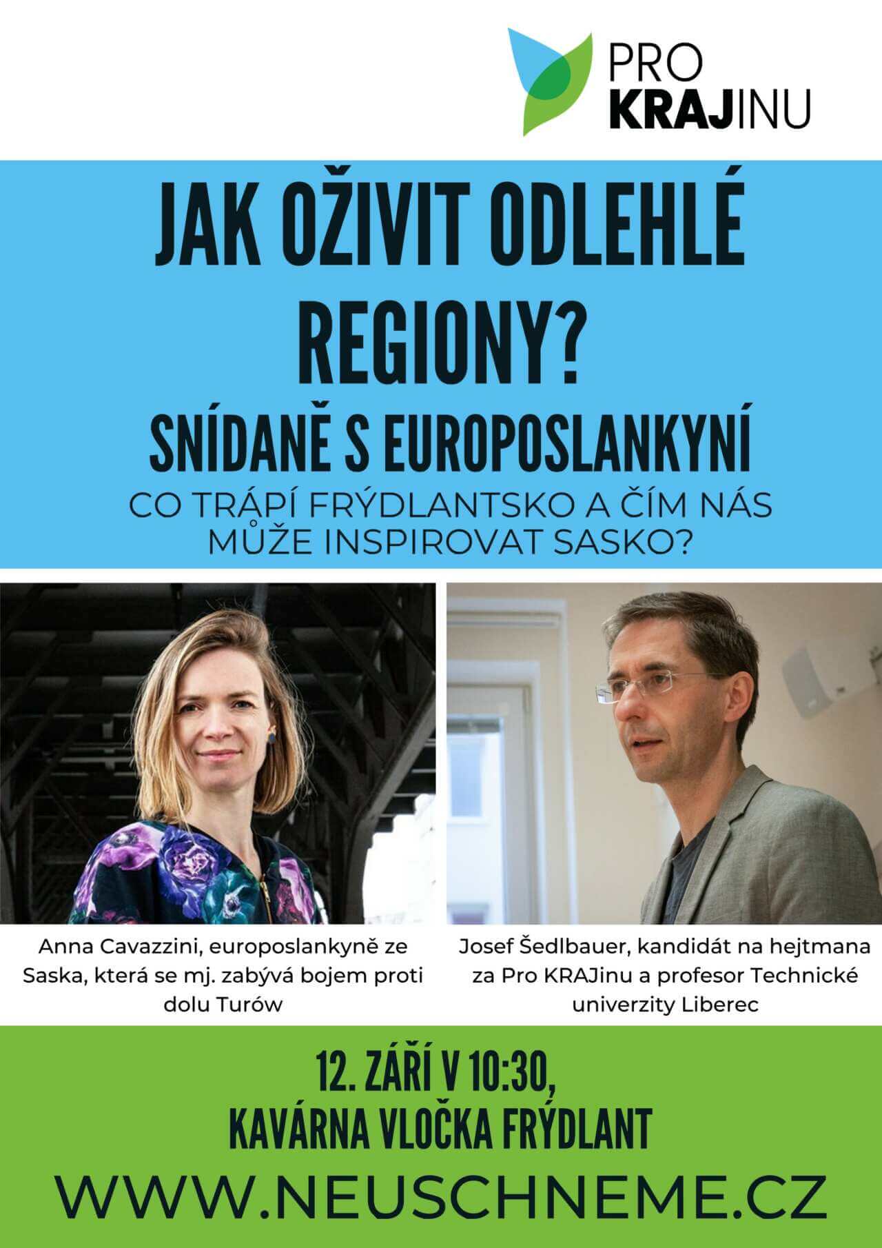 Brunch a debata s europoslankyní Annou Cavazzini a kandidátem na hejtmana Josefem Šedlbauerem JAK OŽIVIT ODLEHLÉ REGIONY? CO TRÁPÍ FRÝDLANTSKO A ČÍM NÁS MŮŽE INSPIROVAT SASKO? Kde: Cukrárna a Kavárna Vločka Frýdlant Kdy: